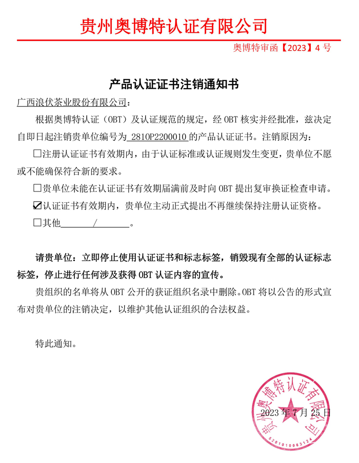 注銷廣西浪伏茶業(yè)股份有限公司產(chǎn)品認(rèn)證證書通知