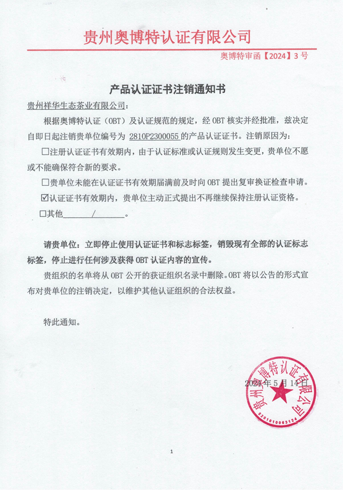 注銷貴州祥華生態(tài)茶業(yè)有限公司產(chǎn)品認(rèn)證證書通知